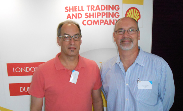 American Maritime Officers members Chief Engineer Michael Green and Cargo Engineer Tom McCarthy "talk tankers" during a break at the Shell International Fleet Officers Conference held outside of London in March. Both sail in the international fleet of LNG carriers managed by Shell.