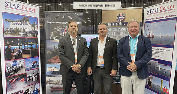 American Maritime Officers National Vice President, Inland Waters, Danny Robichaux, AMO National Executive Vice President Willie Barrere and Captain John Mansfield, AMO wind farm liaison, attended the 2023 International Offshore Wind Partnering Forum in Baltimore, Md. in March. The group met with prospective wind farm groups, discussing the exceptional qualifications of AMO officers prepared for work in this emerging market and the array of training available to AMO members at STAR Center as this segment of the industry develops.